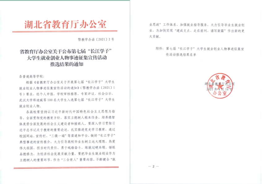 日前,由湖北省教育厅主办的第七届“长江学子”老员工就业创业人物事迹征集活动评选结果揭晓,2名员工当选,永利yl23411官网硕士研究生何宇航入选开拓创新类。