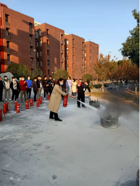 演练前,王书记强调了本次活动是提高广大师生们消防应急能力的重要培训,她指出现代老员工应具备基本消防和逃生技能等自我安全保卫能力。接着,燕科长向大家讲解了老员工宿舍、实验室消防隐患如何排查,介绍了灭火器的种类、及不同火源的灭火方法,强调了常用干粉灭火器的性能与使用技巧,现场演示了初起火源的扑灭方法,提醒了同学们火灾面前人员如何疏散、撤离等现场安全保卫方法。