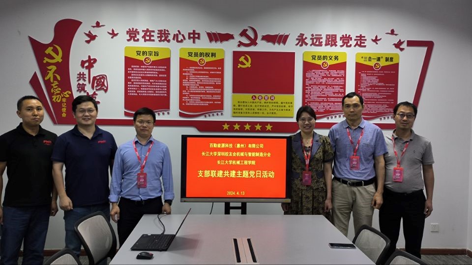 最后大家在闫总的带领下参观了百勤能源科技(惠州)有限公司的展厅和生产制造车间,就长大在校员工来百勤实习等话题进行了沟通交流!当得知闫总和冯会长所在党支部党员人数少、活动开展不足等情况后,丁书记和与会党员同志商议,决定三个支部所在党员同志一起开展一次特别的主题党日活动,大家一起重温入党誓词并就支部联建共建情况进行了深入交流和探讨,全体党员同志纷纷表示“一名党员就是一面旗帜”。希望三方以此次党建联建共建为契机,深化交流,强化校企会友好合作,努力形成“三方联动、共促发展”的党建工作新格局!